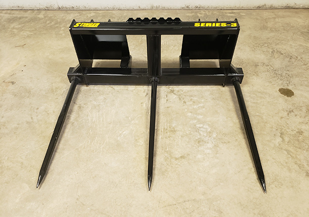 The Stinger Attachments Series 3 bale spear is a perfect piece of equipment for any farmer or large ranch wanting to move large square bales quickly. It is configured in a three tine design, the outer tines are spaces 52” apart on center with one dead center of attachment. The design is available with multiple tine lengths including 39”, 43”, or 49”. All of our bale attachments feature heavy duty design and come standard with replaceable tines.