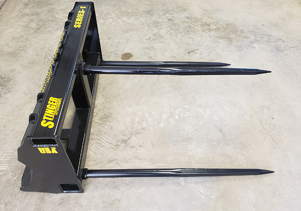 The Stinger Attachments Series 4 bale spear is a perfect piece of equipment for any large ag producer moving large square bales 2 at a time. It is configured in a four bale spear tine design giving you 14,000lbs of carry capacity. The most outer tines are placed 61” apart on center with two additional tines placed evenly between them. This can be purchased with the optional bolt on bale support (only available for 61″) allowing you to safely carry 2 large bales at once. The design is available with multiple tine lengths including 39”, 43”, or 49”. All of our hay bale spike bale attachments feature heavy duty design and come standard with replaceable tines.