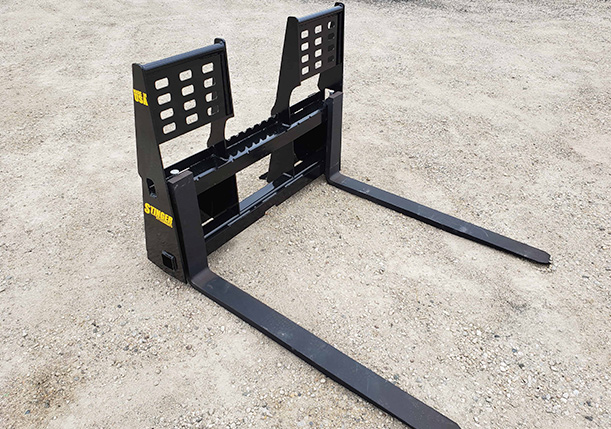 The Stinger Attachments pallet forks are designed for heavy-duty use. We use industry-leading USA forks by Cascade Corp. They are backed by a 3-year warranty. Our frame design features a heavy-duty machined 1.25” x 3” top carrier bar — this top bar is then welded to a 3” x 2” structural tube to make the top support even stronger. The bottom carrier is a ½” x 3” flat welded to a 3” x 3” support tube. Our main carriage uprights are constructed of 3/8” grade 50 steel. Our skid steer loader pallet forks are manufactured in a jig fixture by man to ensure high tolerances. Our high tolerances are important because this allows the fork to slide easily.
