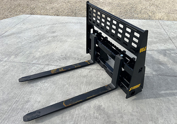 The Stinger Attachments pallet forks are designed for heavy-duty use. We use industry-leading USA forks by Cascade Corp. They are backed by a 3-year warranty. Our frame design features a heavy-duty machined 1.25” x 3” top carrier bar — this top bar is then welded to a 3” x 2” structural tube to make the top support even stronger. The bottom carrier is a ½” x 3” flat welded to a 3” x 3” support tube. Our main carriage uprights are constructed of 3/8” grade 50 steel. Our skid steer loader pallet forks are manufactured in a jig fixture by man to ensure high tolerances. Our high tolerances are important because this allows the fork to slide easily.