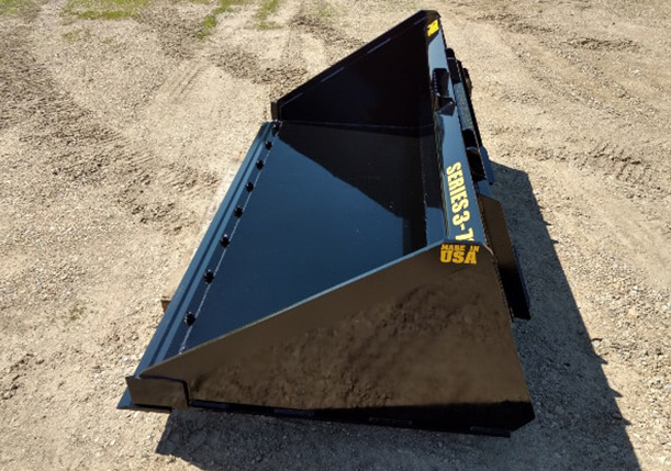 The Series 3 Skid Steer Material bucket attachment is a step up in capacity from our series 2. Series 3 is engineered to provide more capacity for larger skid steer wheeled and track machines. Available in 5 different sizes from 60 to 84” inches in width. This material bucket attachment comes standard with a universal skid steer mount plate. We can also custom fit other mounting options or leave plain so you have the option to custom fit your own. Our top channel brace and bottom radius support add the strength needed to handle the biggest machines. The bottom-radius support also adds better clean out. Our standard back degree angle is 68 degrees. We have found this to be a very good fit for most machines in the roll-back and dump positions.