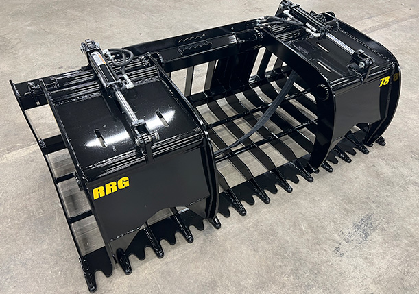 The RRG Series skid steer grapple bucket is a mix of our rock and root grapples. It has a narrower opening (6”) than our or standard root grapples but shares the serrated edge our rock grapples are fitted with. One of the benefits of this is it creates a lighter attachment for some smaller machines and compact tractors. This grapple is great for moving brush, logs, and debris. It is very popular for residential customers and hobby farms. Even though it is a lighter attachment, it is still built with quality and strength. The double pipe between the tines and ½” serrated cut edge make this very strong. It is fitted with two independent grapples that have a large 48” opening and are greaseable. It comes standard with hydraulic hose and ½” flat face couplers. The entire attachment is constructed of quality grade 50 material to ensure long life.