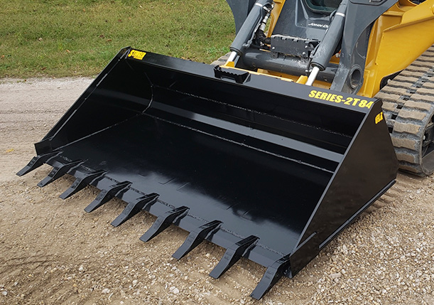The heavy-duty tooth bucket from Stinger Attachments features our standard 21” tall height with a deep 36” bottom and is engineered to provide maximum strength and digging capabilities for the biggest track skid steers on the market. The bucket’s deep bottom allows for excellent visibility during use. Available in 5 different sizes from 60 to 84” inches in width. This bucket is a great fit for loader tractors and medium- to large-frame skid-steer machines, wheel or track.